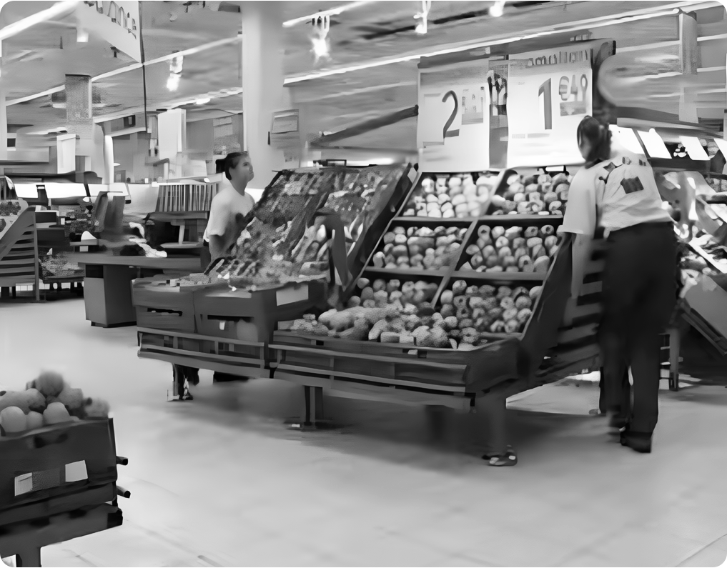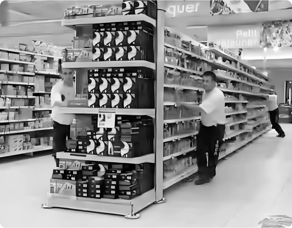 Pitkät myymälähyllyt tavaroineen voidaan siirtää uuteen paikkaan kun käytetään FOURMI -siirtopyöriä. Muutostyö voidaan tehdä kaupan aukioloaikana.